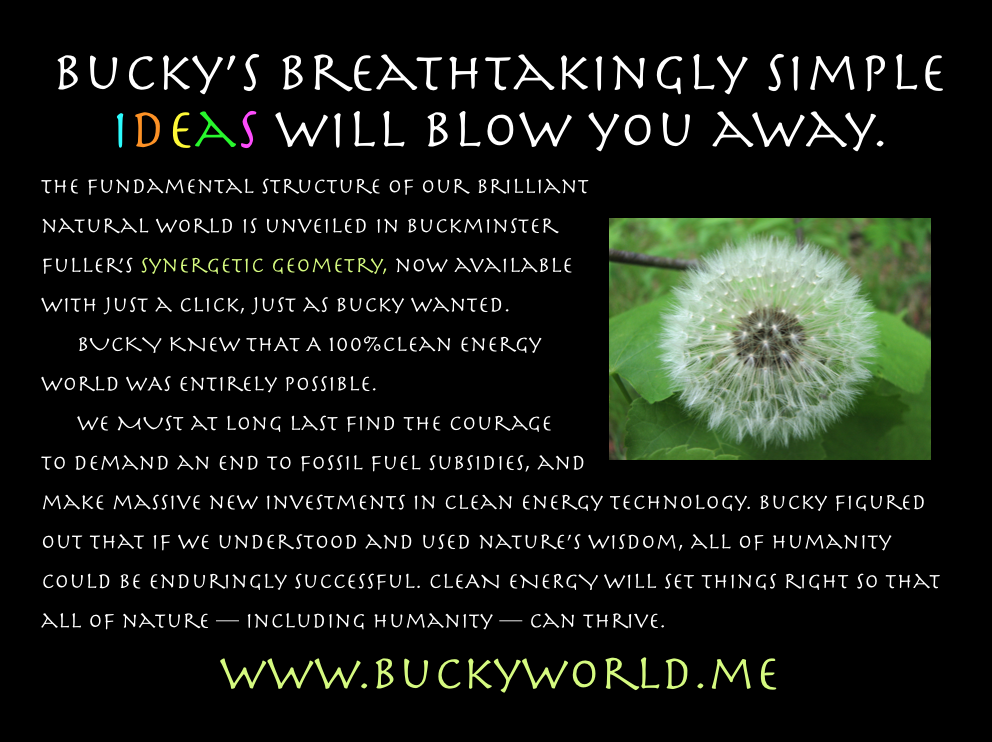 Every time Bucky comes bouncing back into the mainstream, a few paid hacks for the oil guys pick up their poison pens and slander away. Here’s an example, from the Weekly Standard July, 2008: “We had thought that the ghost of Buckminster Fuller (1895-1983) had been thankfully dormant for the past quarter-century, but how wrong we were. Not only is Manhattan’s trendy Whitney Museum putting on a retrospective in his honor, but Newsweek resurrects, for a few minutes’ duration, the reputation of one of the arch cranks of the sixties. You had to be either a drug-crazed hippie or a philosophical adherent of Flower Power to take Bucky seriously.” The writer knew exactly why Bucky was an “arch crank”, because Bucky knew the fossil fuel industry agreed in 1965 that a phase out of fossil fuels was necessary and inevitable. He also knew that by time Ronald Reagan took the solar panels off the White House in 1979, and deregulated both industry and finance, it was indeed “a new morning in America” when the grip of big oil was like a boa constrictor around our healthy human lives.
